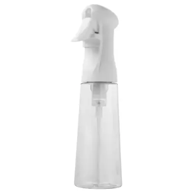 Plastic water spray bottle with a 360° sprayer. An innovative spray mechanism provides a continuous stream of liquid with a single press of the trigger. It can be used even when the bottle is turned upside down. The ergonomic design ensures a comfortable grip and reduces hand fatigue. Suitable for both professional and personal use.