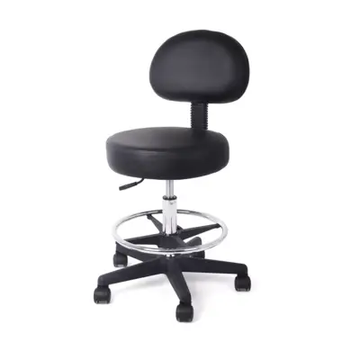 Work stool with an adjustable height, backrest and footrest used in hairdressing and beauty salons.