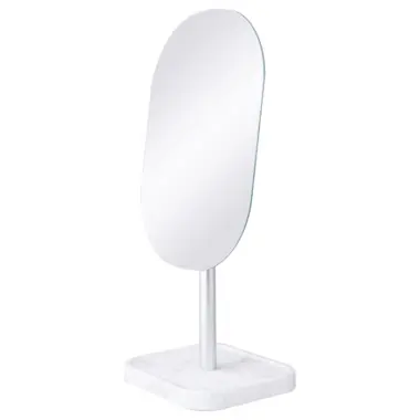 Jednostrano kozmetičko ogledalo elegantnog dizajna. Postolje ogledala je sa printom mermera i podlogom koja omogućava da ogledalo čvrsto stoji na radnoj površini.