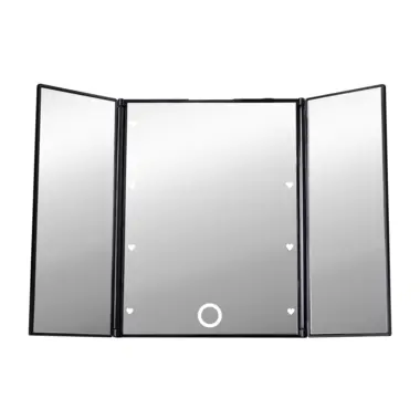 Trodelno kozmetičko ogledalo sa LED svetlom. Diode na srednjem ogledalu su u obliku mini srca i emituju belo svetlo. Ogledalo može samostalno da se oslanja na površinu pomoću držača, koji se nalazi na poleđini (princip rama za slike).