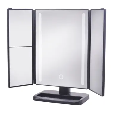 Trodelno kozmetičko ogledalo u crnoj boji, sa LED diodama (belo svetlo) i postoljem. Povezuje se sa izvorom napajanja preko USB-a ili 4 AA baterije. Sadrži prekidač ON/OFF za uključenje svetla.