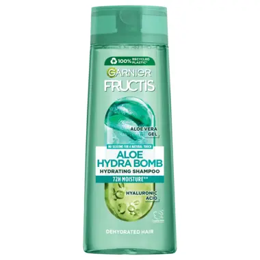 Garnier Fructis šampon za negu dehidrirane kose, sa aktivnim sastojcima aloje, hijaluronske kiseline i glicerina. Bogata formula bez silikona, hidrira, obnavlja i jača kosu od korena do krajeva i do 72 h, bez otežavanja.