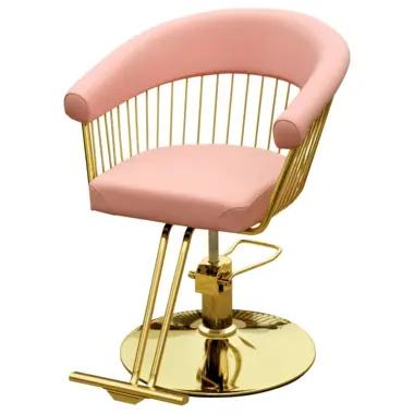 Frizerska radna stolica svetloroze boje, sa hidraulikom, namenjena za korišćenje u salonima prilikom šišanja, feniranja i drugih frizerskih tretmana. Zahvaljujući mogućnosti podešavanja visine stolice, klijentu se omogućava dodatna udobnost, a frizeru komforan rad.