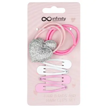 Infinity set šnalica i gumica, bele i roze boje. Šnalice mogu da obuhvate manje pramenove, držeći ih čvrsto na mestu.