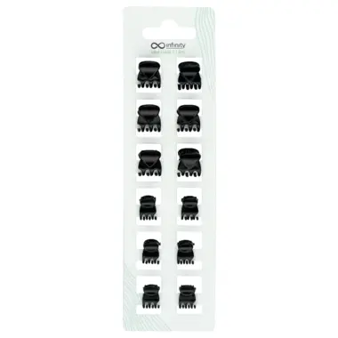 Crne mini šnale za kosu izrađene od plastike. Poseduju zaobljene zupce i nežne su prema kosi. Mogu da obuhvate manje pramenove, držeći ih čvrsto na mestu.