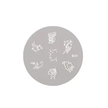 Okrugli metalni šablon ASN B04 napravljen od visokokvalitetnog nerđajućeg čelika sa različitim ugraviranim dizajnima i pozadinom od vinila, za jednostavnu upotrebu.