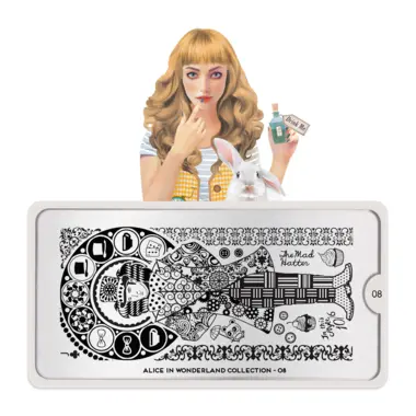 Alice 08 šablon pločica napravljena je od visoko kvalitetnog nerđajućeg čelika sa velikim izborom ugraviranih šara i pozadinom od vinila, za jednostavnu upotrebu.