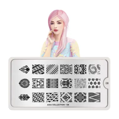 Asia 08 šablon pločica napravljena je od visoko kvalitetnog nerđajućeg čelika sa velikim izborom ugraviranih šara i pozadinom od vinila, za jednostavnu upotrebu.