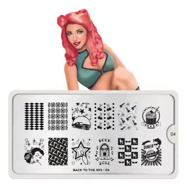Back to 50s 04 šablon pločica napravljena je od visoko kvalitetnog nerđajućeg čelika sa velikim izborom ugraviranih šara i pozadinom od vinila, za jednostavnu upotrebu.
