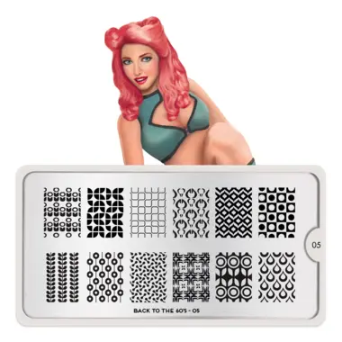 Back to 60s 05 šablon pločica napravljena je od visoko kvalitetnog nerđajućeg čelika sa velikim izborom ugraviranih šara i pozadinom od vinila, za jednostavnu upotrebu.