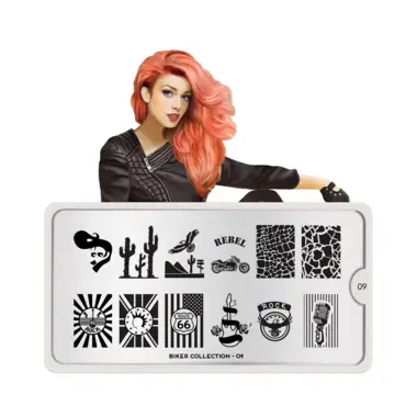 Biker 09 šablon pločica napravljena je od visoko kvalitetnog nerđajućeg čelika sa velikim izborom ugraviranih šara i pozadinom od vinila, za jednostavnu upotrebu.