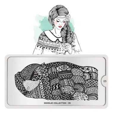 Doodles 05 šablon pločica napravljena je od visoko kvalitetnog nerđajućeg čelika sa velikim izborom ugraviranih šara i pozadinom od vinila, za jednostavnu upotrebu.