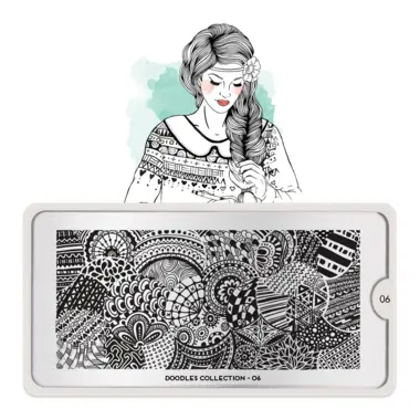 Doodles 06 šablon pločica napravljena je od visoko kvalitetnog nerđajućeg čelika sa velikim izborom ugraviranih šara i pozadinom od vinila, za jednostavnu upotrebu.