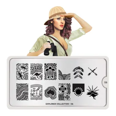 Explorer 06 šablon pločica napravljena je od visoko kvalitetnog nerđajućeg čelika sa velikim izborom ugraviranih šara i pozadinom od vinila, za jednostavnu upotrebu.