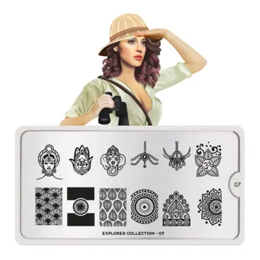 Explorer 07 šablon pločica napravljena je od visoko kvalitetnog nerđajućeg čelika sa velikim izborom ugraviranih šara i pozadinom od vinila, za jednostavnu upotrebu.