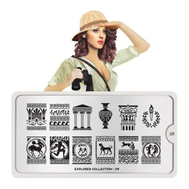 Explorer 09 šablon pločica napravljena je od visoko kvalitetnog nerđajućeg čelika sa velikim izborom ugraviranih šara i pozadinom od vinila, za jednostavnu upotrebu.