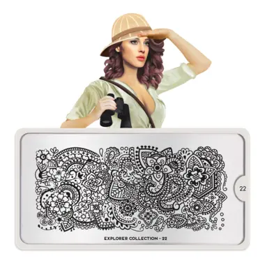 Explorer 22 šablon pločica napravljena je od visoko kvalitetnog nerđajućeg čelika sa velikim izborom ugraviranih šara i pozadinom od vinila, za jednostavnu upotrebu.