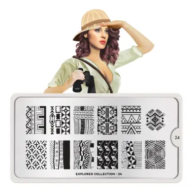 Explorer 24 šablon pločica napravljena je od visoko kvalitetnog nerđajućeg čelika sa velikim izborom ugraviranih šara i pozadinom od vinila, za jednostavnu upotrebu.