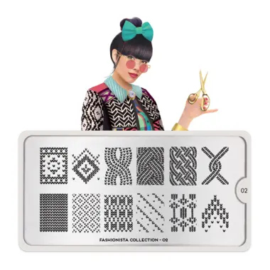 Fashionista 02 šablon pločica napravljena je od visoko kvalitetnog nerđajućeg čelika sa velikim izborom ugraviranih šara i pozadinom od vinila, za jednostavnu upotrebu.
