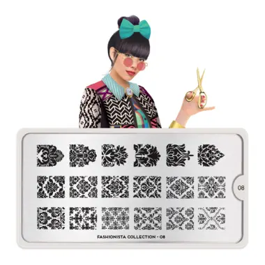 Fashionista 08 šablon pločica napravljena je od visoko kvalitetnog nerđajućeg čelika sa velikim izborom ugraviranih šara i pozadinom od vinila, za jednostavnu upotrebu.