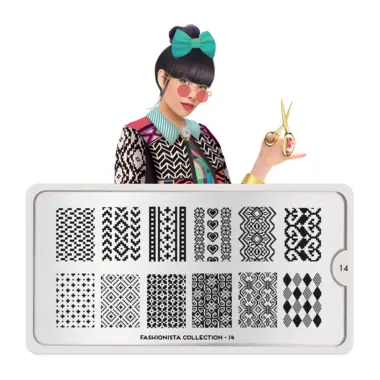 Fashionista 14 šablon pločica napravljena je od visoko kvalitetnog nerđajućeg čelika sa velikim izborom ugraviranih šara i pozadinom od vinila, za jednostavnu upotrebu.