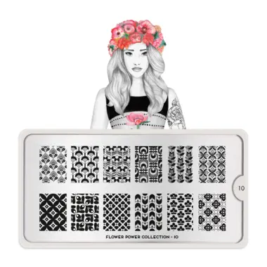 Flower Power 10 šablon pločica napravljena je od visoko kvalitetnog nerđajućeg čelika sa velikim izborom ugraviranih šara i pozadinom od vinila, za jednostavnu upotrebu.