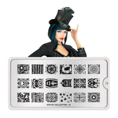 Gothic 12 šablon pločica napravljena je od visoko kvalitetnog nerđajućeg čelika sa velikim izborom ugraviranih šara i pozadinom od vinila, za jednostavnu upotrebu.
