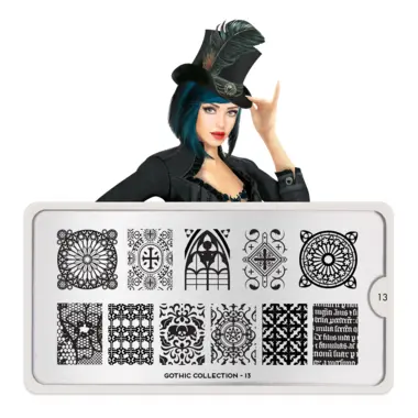 Gothic 13 šablon pločica napravljena je od visoko kvalitetnog nerđajućeg čelika sa velikim izborom ugraviranih šara i pozadinom od vinila, za jednostavnu upotrebu.