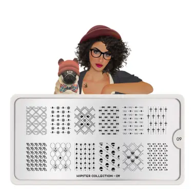 Hipster 09 šablon pločica napravljena je od visoko kvalitetnog nerđajućeg čelika sa velikim izborom ugraviranih šara i pozadinom od vinila, za jednostavnu upotrebu.