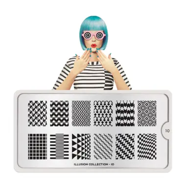 Illusion 10 šablon pločica napravljena je od visoko kvalitetnog nerđajućeg čelika sa velikim izborom ugraviranih šara i pozadinom od vinila, za jednostavnu upotrebu.