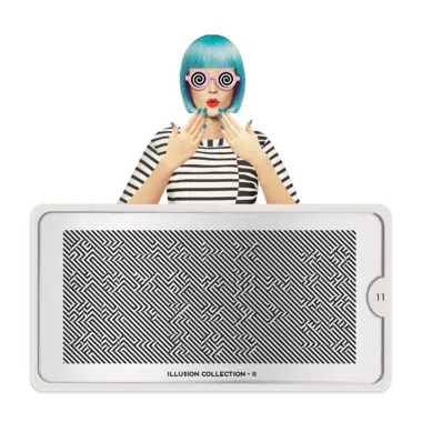 Illusion 11 šablon pločica napravljena je od visoko kvalitetnog nerđajućeg čelika sa velikim izborom ugraviranih šara i pozadinom od vinila, za jednostavnu upotrebu.