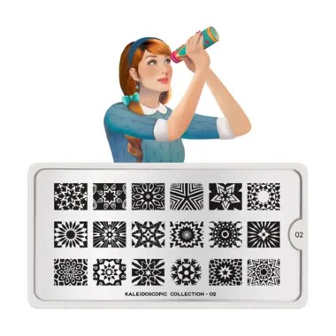Kaleidoscope 02 šablon pločica napravljena je od visoko kvalitetnog nerđajućeg čelika sa velikim izborom ugraviranih šara i pozadinom od vinila, za jednostavnu upotrebu.