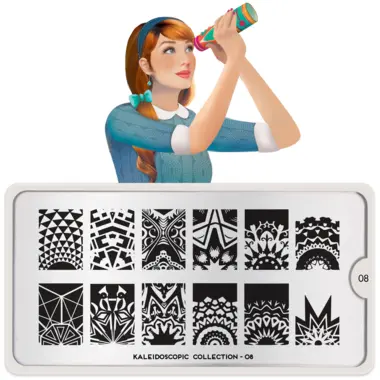 Kaleidoscope 08 šablon pločica napravljena je od visoko kvalitetnog nerđajućeg čelika sa velikim izborom ugraviranih šara i pozadinom od vinila, za jednostavnu upotrebu.