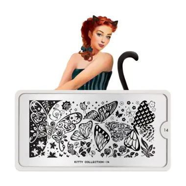 Kitty 14 šablon pločica napravljena je od visoko kvalitetnog nerđajućeg čelika sa velikim izborom ugraviranih šara i pozadinom od vinila, za jednostavnu upotrebu.