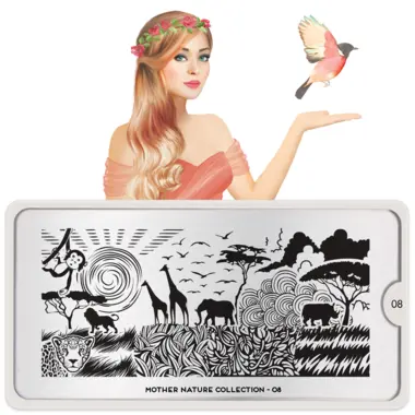 Mother Nature 08 šablon pločica napravljena je od visoko kvalitetnog nerđajućeg čelika sa velikim izborom ugraviranih šara i pozadinom od vinila, za jednostavnu upotrebu.