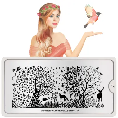 Nature 14 šablon pločica napravljena je od visoko kvalitetnog nerđajućeg čelika sa velikim izborom ugraviranih šara i pozadinom od vinila, za jednostavnu upotrebu.