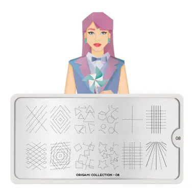 Origami 08 šablon pločica napravljena je od visoko kvalitetnog nerđajućeg čelika sa velikim izborom ugraviranih šara i pozadinom od vinila, za jednostavnu upotrebu.