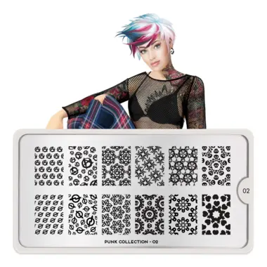 Punk 02 šablon pločica napravljena je od visoko kvalitetnog nerđajućeg čelika sa velikim izborom ugraviranih šara i pozadinom od vinila, za jednostavnu upotrebu.