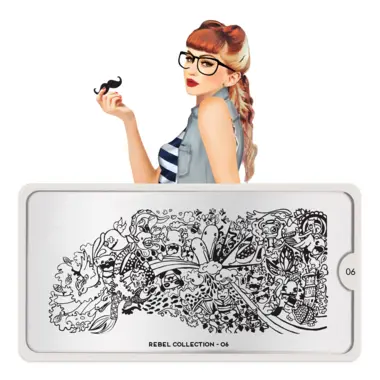 Rebel 06 šablon pločica napravljena je od visoko kvalitetnog nerđajućeg čelika sa velikim izborom ugraviranih šara i pozadinom od vinila, za jednostavnu upotrebu.
