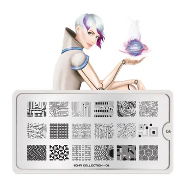 Sci-Fi 06 šablon pločica napravljena je od visoko kvalitetnog nerđajućeg čelika sa velikim izborom ugraviranih šara i pozadinom od vinila, za jednostavnu upotrebu.