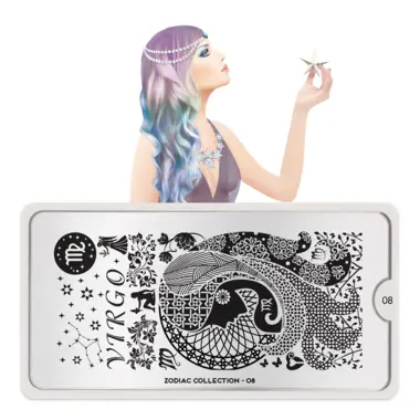 Zodiac 08 šablon pločica napravljena je od visoko kvalitetnog nerđajućeg čelika sa velikim izborom ugraviranih šara i pozadinom od vinila, za jednostavnu upotrebu.