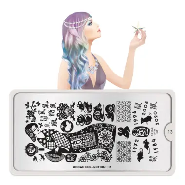 Zodiac 13 šablon pločica napravljena je od visoko kvalitetnog nerđajućeg čelika sa velikim izborom ugraviranih šara i pozadinom od vinila, za jednostavnu upotrebu.