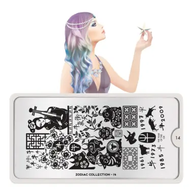 Zodiac 14 šablon pločica napravljena je od visoko kvalitetnog nerđajućeg čelika sa velikim izborom ugraviranih šara i pozadinom od vinila, za jednostavnu upotrebu.