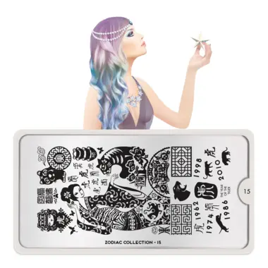 Zodiac 15 šablon pločica napravljena je od visoko kvalitetnog nerđajućeg čelika sa velikim izborom ugraviranih šara i pozadinom od vinila, za jednostavnu upotrebu.