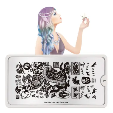 Zodiac 19 šablon pločica napravljena je od visoko kvalitetnog nerđajućeg čelika sa velikim izborom ugraviranih šara i pozadinom od vinila, za jednostavnu upotrebu.