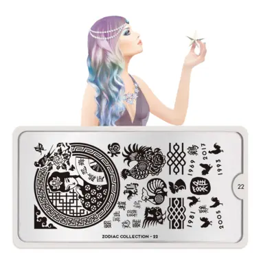 Zodiac 22 šablon pločica napravljena je od visoko kvalitetnog nerđajućeg čelika sa velikim izborom ugraviranih šara i pozadinom od vinila, za jednostavnu upotrebu.