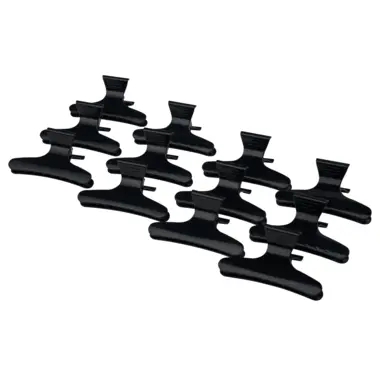 Plastične štipaljke za kosu crne boje. Mogu da obuhvate veće pramenove kose, držeći ih čvrsto na mestu. Pakovanje sadrži 12 komada.